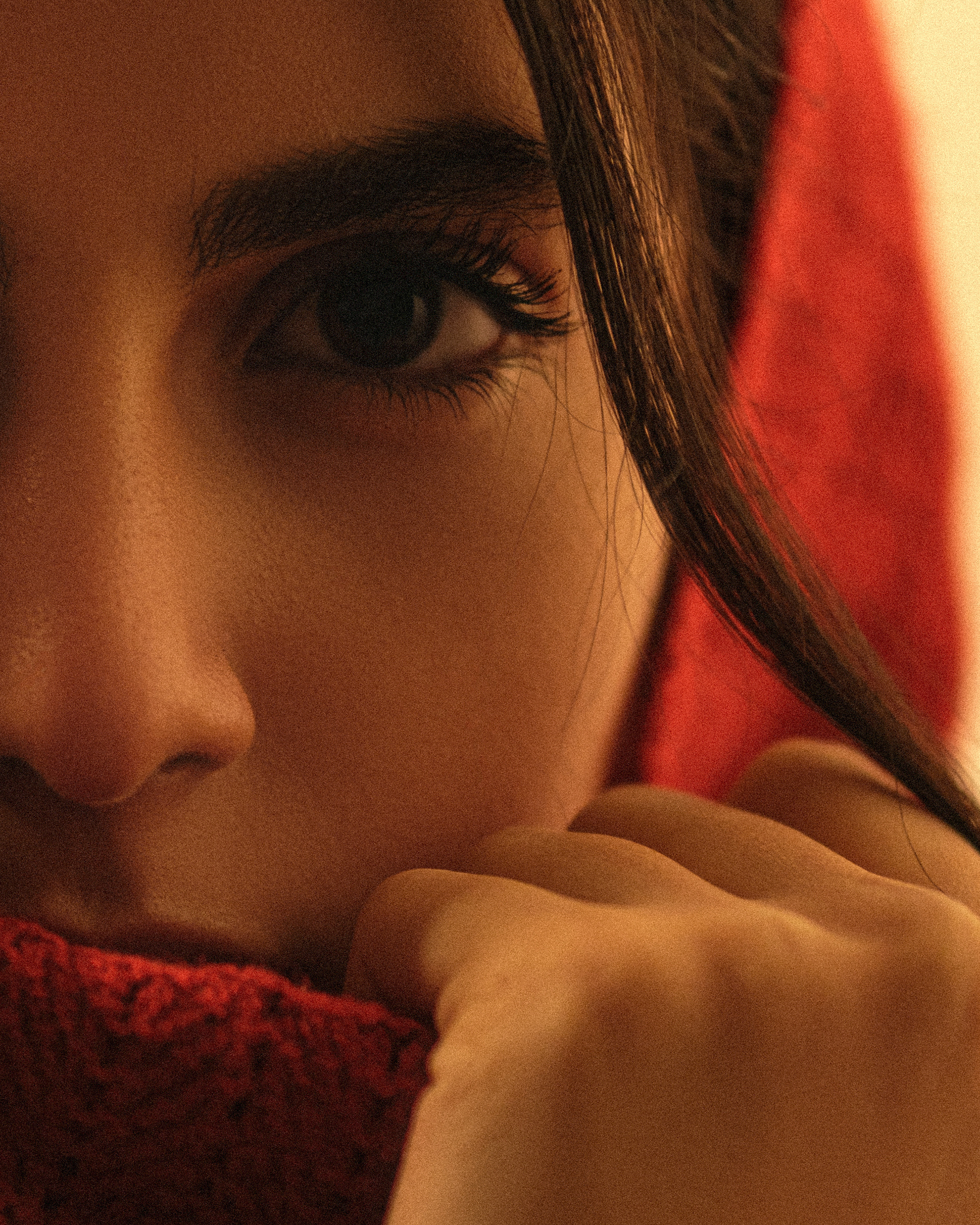 Wrapped in red and kissed by gold, she stands somewhere between softness and strength.