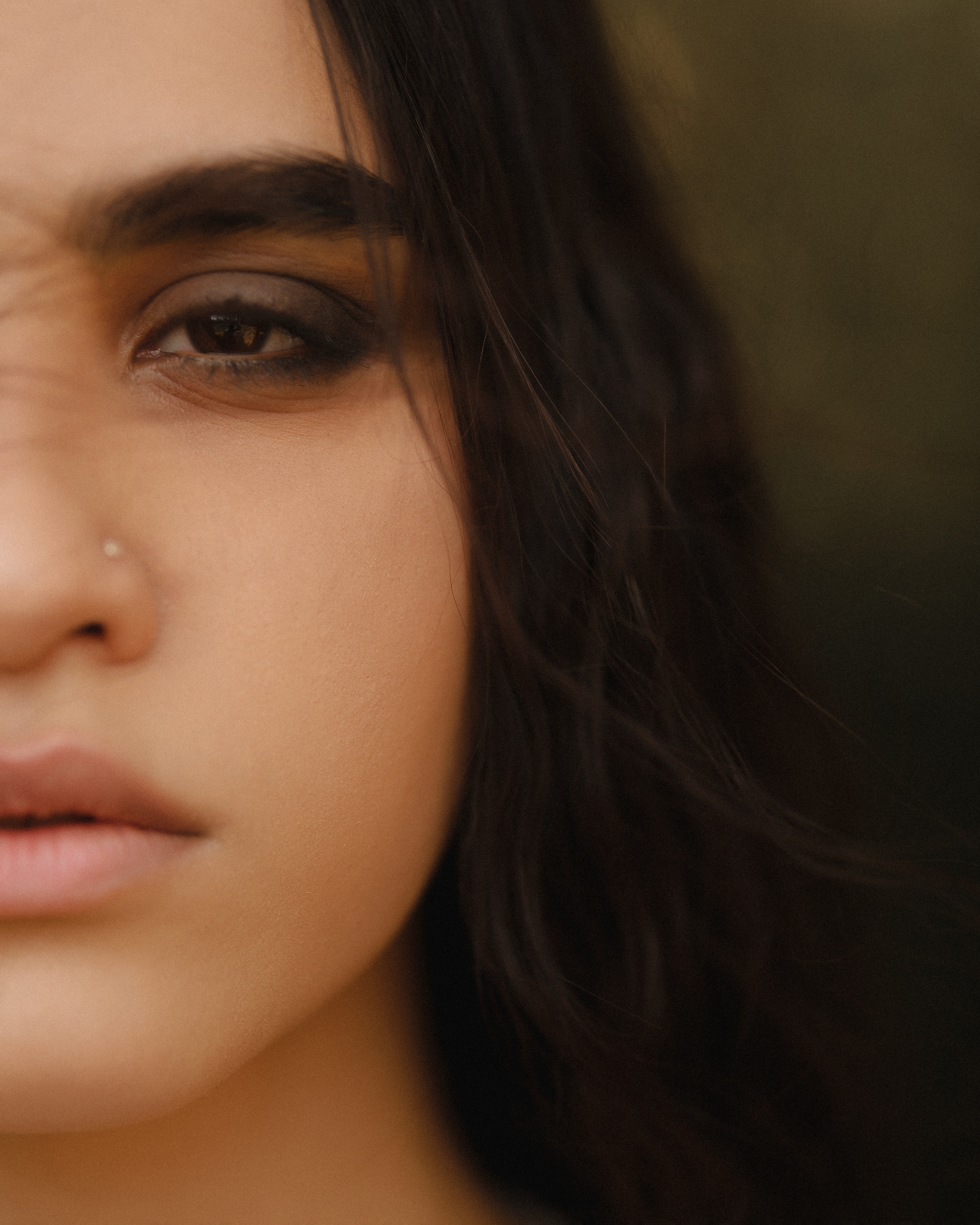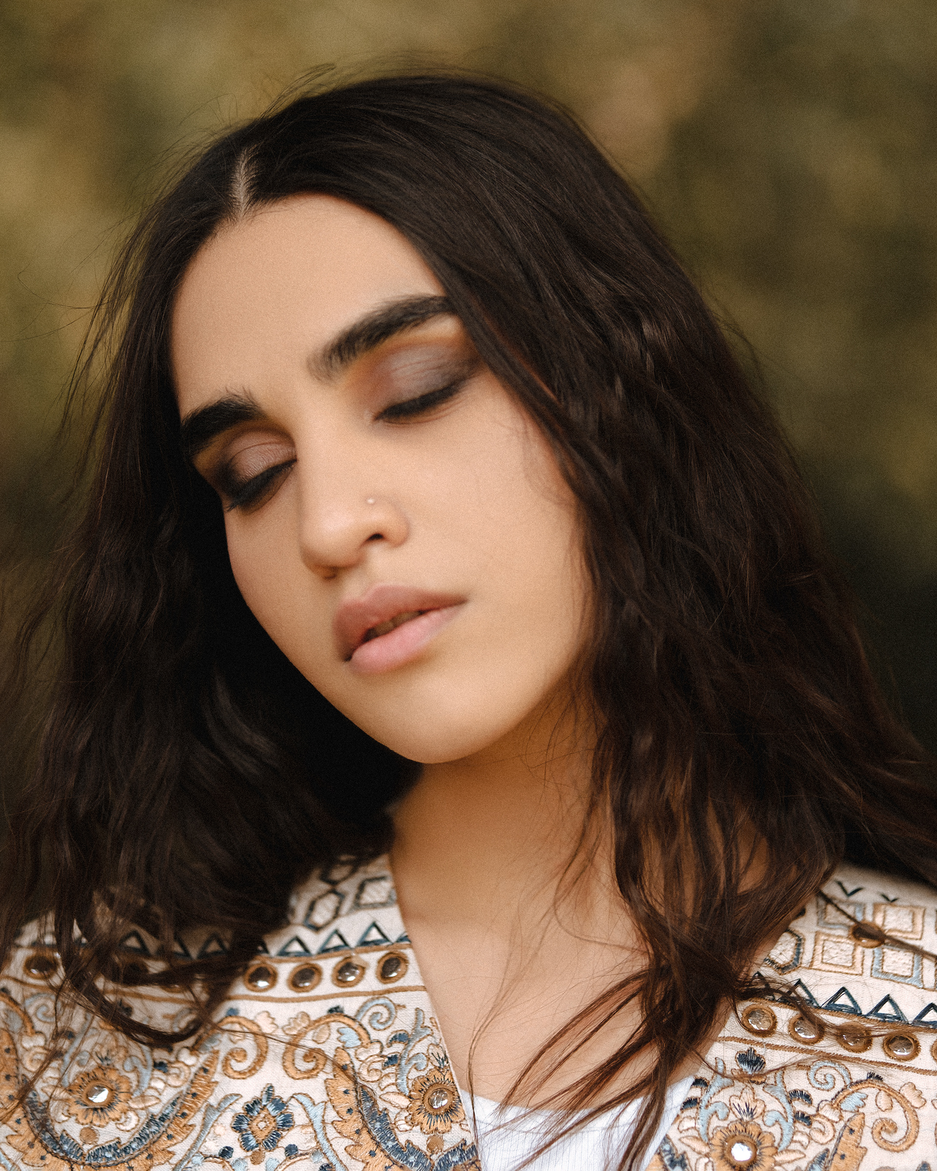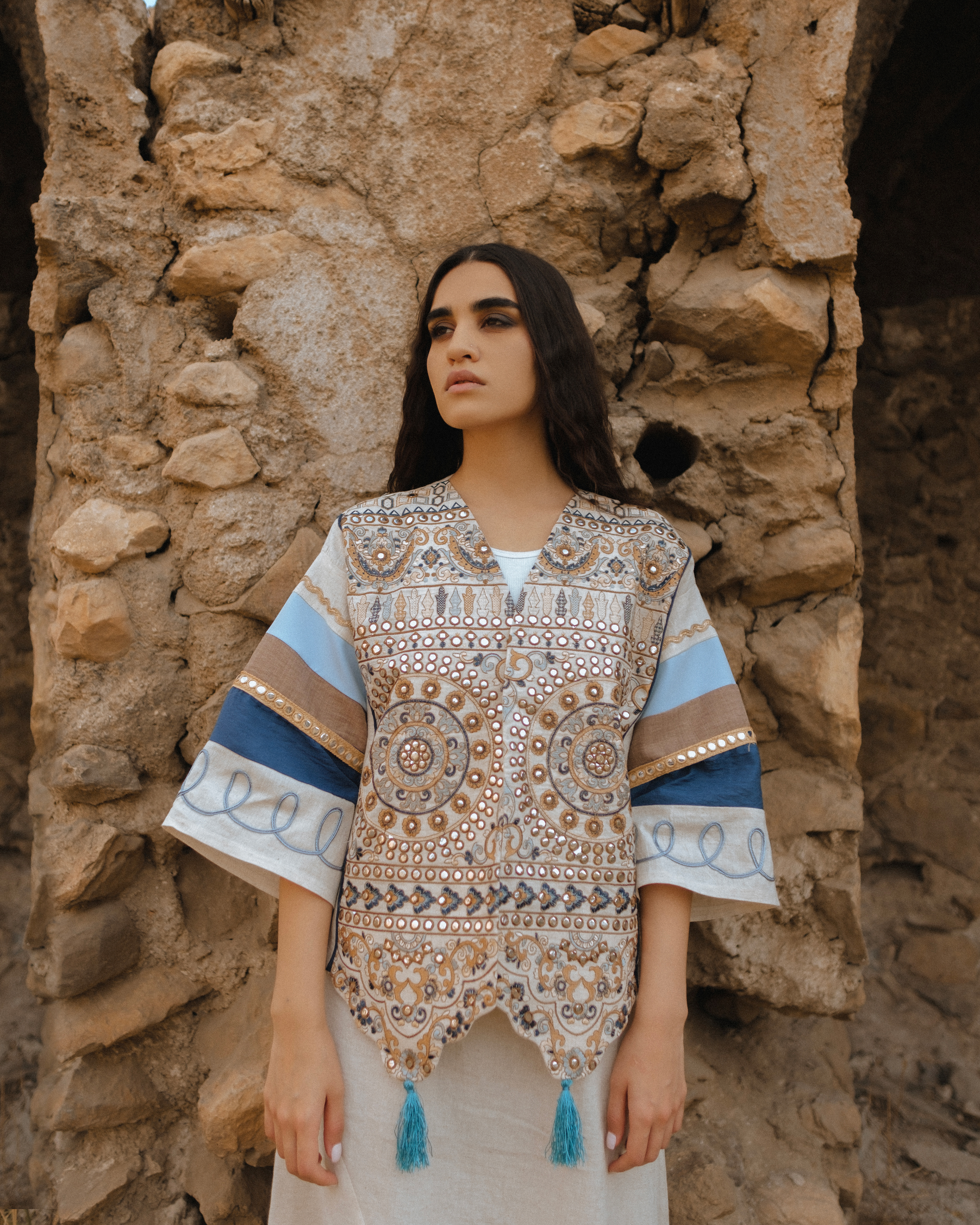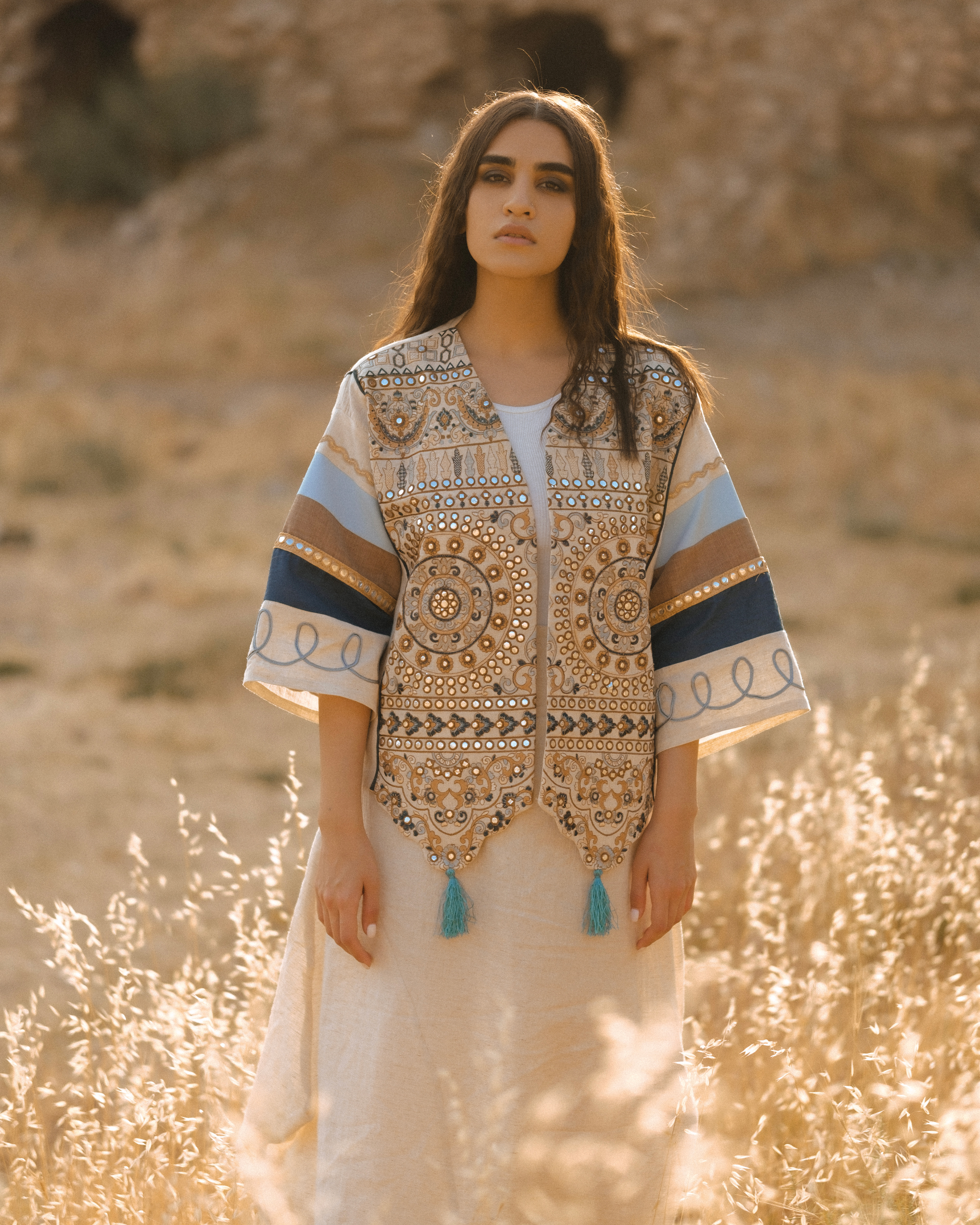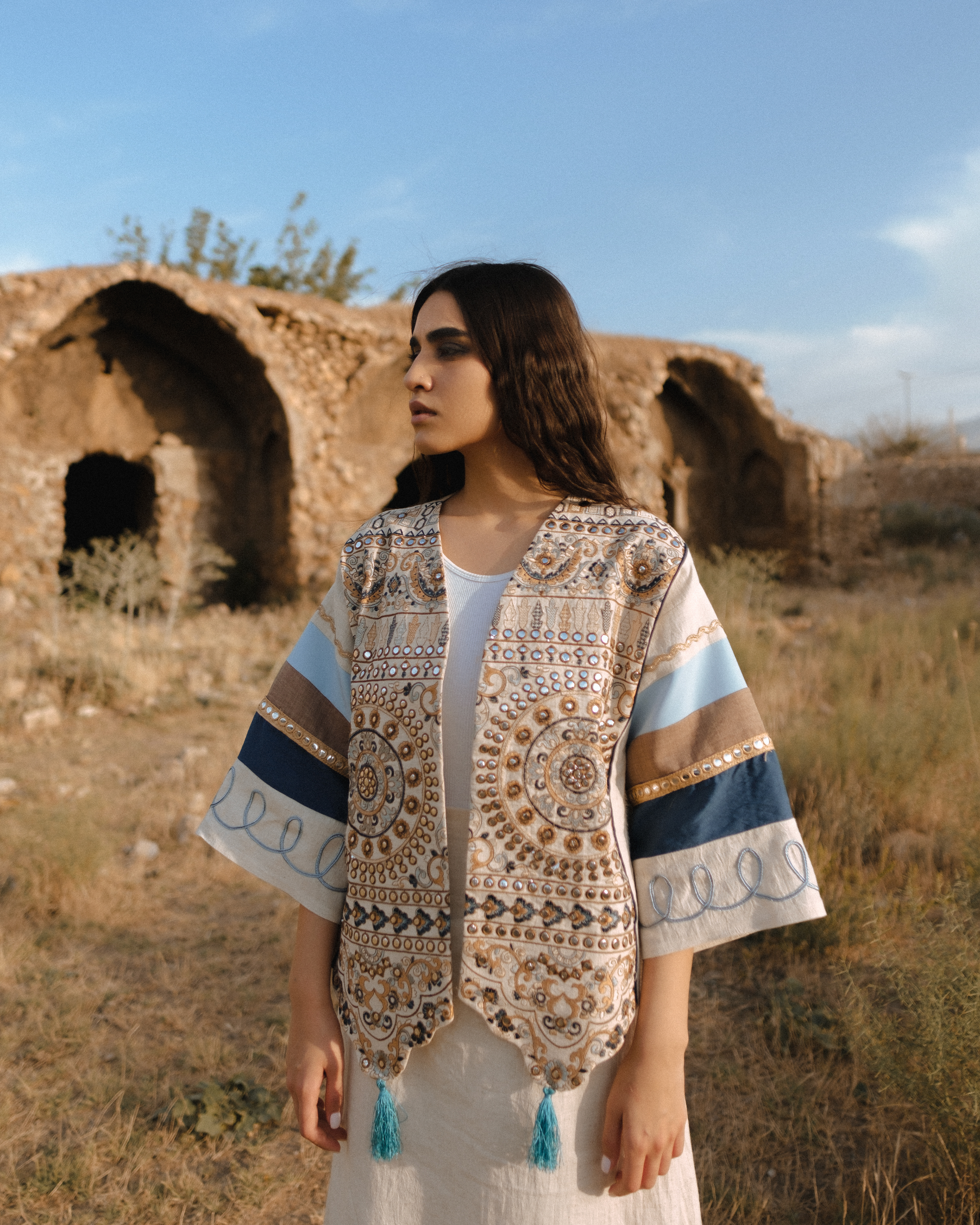 Bathed in sunlight, she walks through the silent bones of history, draped in tradition, echoing a culture carved in stone.