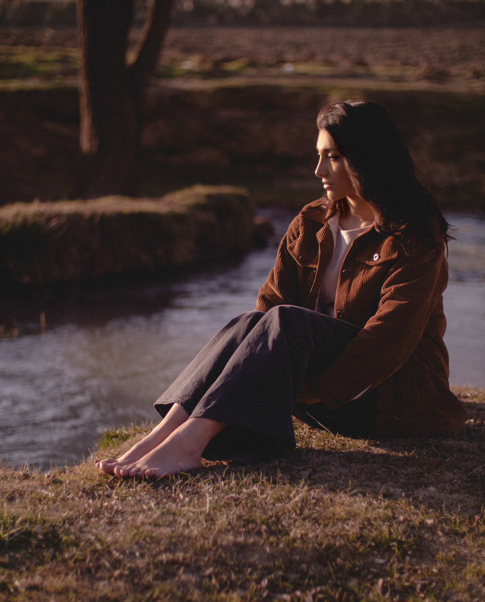 Barefoot and still, she looks into the water, where silence ripples, and every tone feels warm.