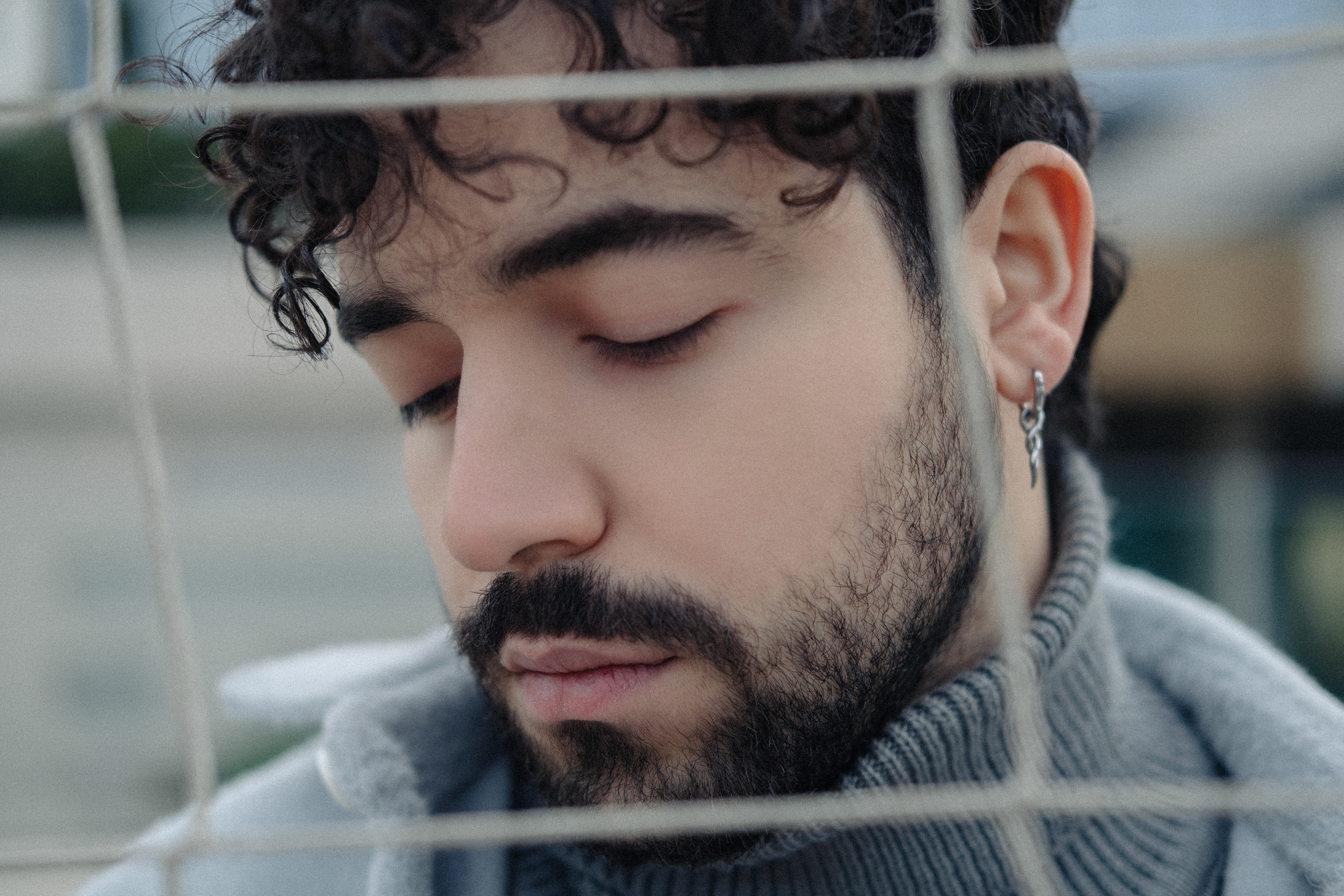 Behind the net, he stands composed, a quiet figure framed in cold tones and quiet distance.