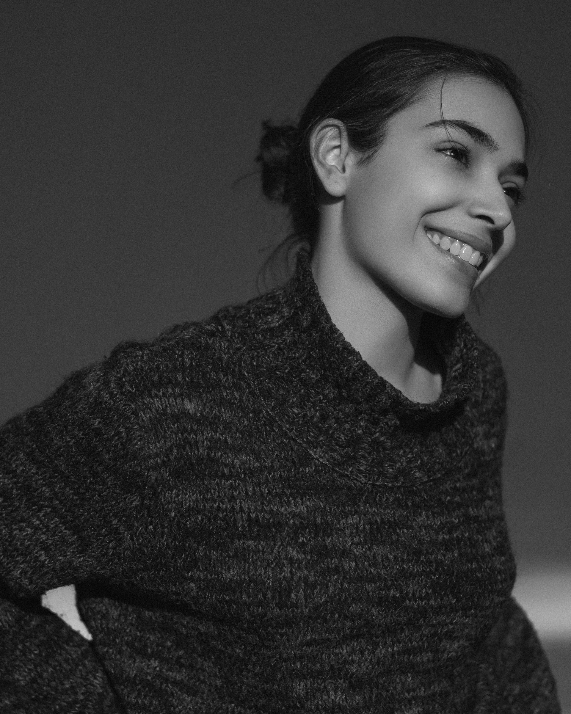 her smile softens the silence, while her eyes hold stories the light almost misses.