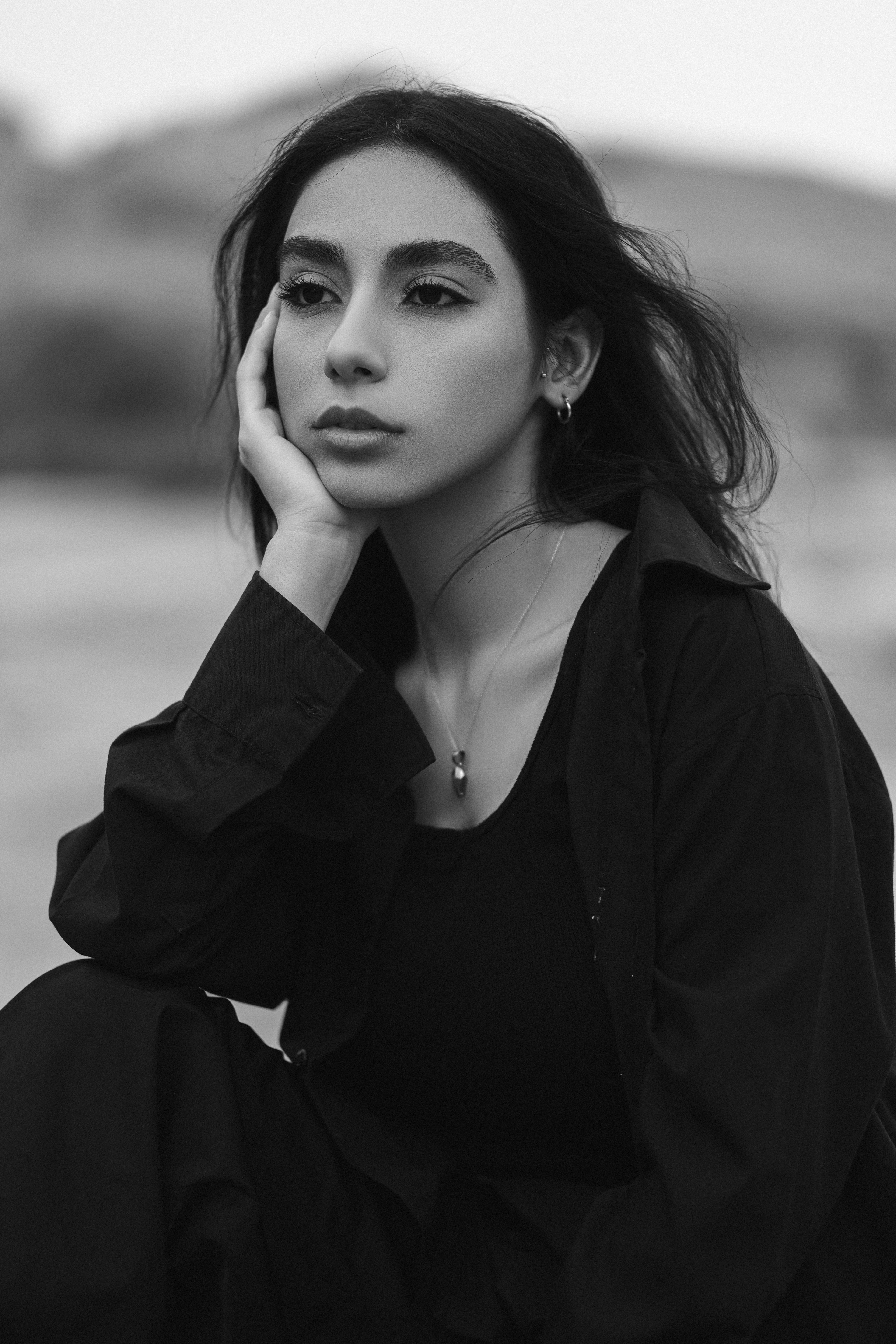 By the river, beneath white blossoms, she stands in quiet contrast.